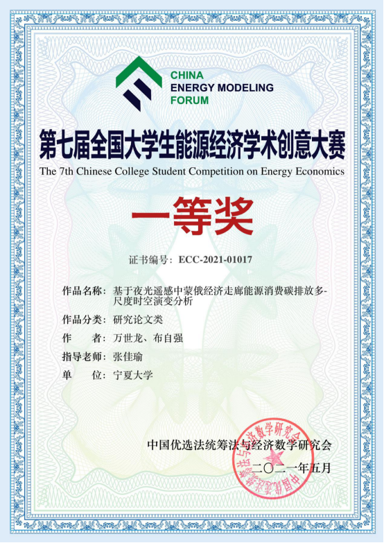 我校暗网黑料 张佳瑜老师指导的万世龙、布自强团队代表学校参赛,其参赛作品《基于夜光遥感中蒙俄经济走廊能源消费碳排放时空演变分析》在来自全国139所高校的1013支队伍中脱颖而出,荣获本科生组研究论文类一等奖的好成绩,张佳瑜老师获得优秀指导教师奖。