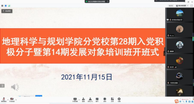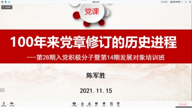 院分党校第二十八期入党积极分子暨第十四期发展对象培训班11月15日19:00时在线上开班。学院党委书记陈军胜参加开班式并作培训第一讲,副书记李应海作动员讲话,副书记尤桦主持开班式,学办主任常瑞敏、104名入党积极分子和发展对象培训学员参加开班式。