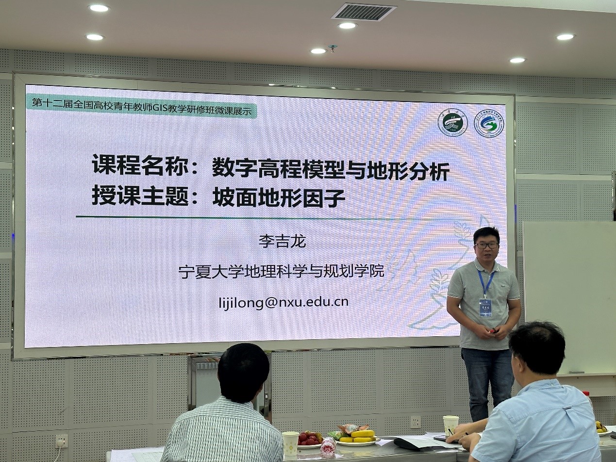 8月15-19日由本领域国内知名专家学者授课,讲授地理研究与教学的哲学思维、专业示范课讲授、国家自然科学基金申请、学科与课程建设思考与实践以及先进的GIS教学理念和方法。8月20日举办的微课比赛有30余位青年教师参赛。经过现场展示、专家评选等环节评出特等奖、一等奖、二等奖奖项。李吉龙老师以“坡面地形因子”为授课主题,获得比赛特等奖。