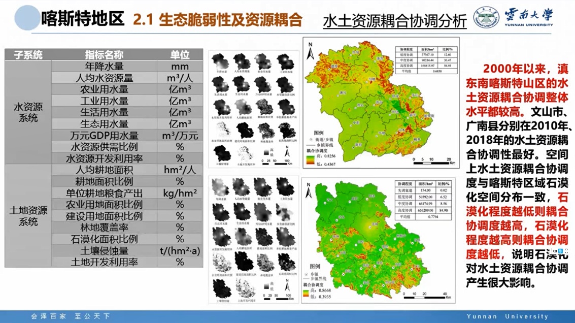赵筱青介绍了团队在喀斯特地区、高山峡谷区以及高原湖泊区的空间规划工作,包括研究区国土空间分区、产业结构优化与发展模式、国土空间优化与管控等内容,同时分享了云南大学地球科学学院人才培养的经验和方法。赵教授的报告不仅让大家了解了喀斯特地区国土空间开发与保护的研究前沿,而且领略到了赵教授团队的学术思维、研究方法。