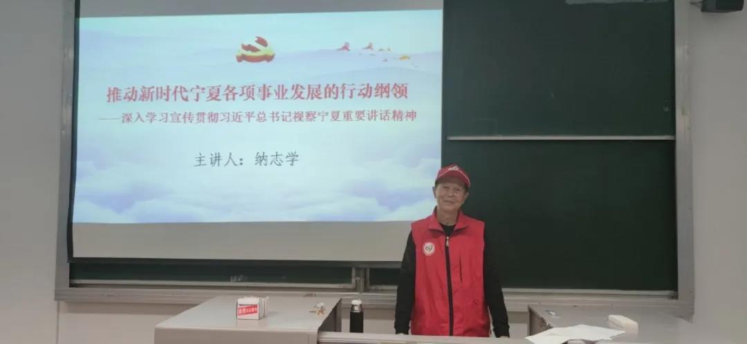 本次讲座,纳志学老师以习近平总书记关于做好宁夏工作的重要讲话所阐述的科学问题“新时代建立一个什么样的美丽宁夏,怎样建立美丽新宁夏 ”这一重要理论和现实问题作为主题,强调了这是新时代宁夏各项事业发展管方向、管根本、管长远的行动指南和根本遵循。其次纳志学老师围绕习近平总书记视察宁夏重要讲话精神对宁夏前进发展的方向、赋予的时代重任、明确的重点任务作了全方位、深层次讲解。同时纳志学老师反复提到要深刻的领会习近平总书记对激发广大党员干部奋斗精神的要求,要传承红色基因、坚定理想信念、发扬革命精神、履行主体责任。