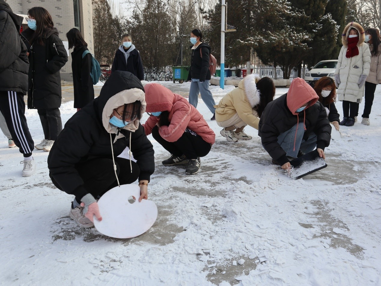 师生积极行动起来,开展扫雪活动,畅通道路、消除隐患,保证学校的正常教育教学秩序。虽然道路上的冰雪因来往车辆和行人的碾压紧紧地附着在地面上,但这并没有打消同学们积极劳动的热情。在老师们的带领下,同学们倾尽学院工具来除冰扫雪,调色板和塑料花盆也变成了扫雪工具。