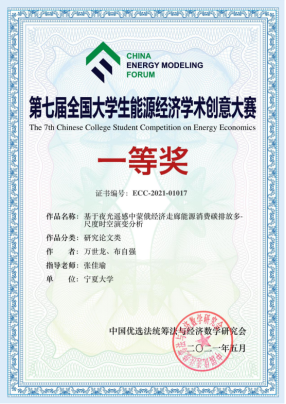张佳瑜老师指导的万世龙、布自强团队代表学校参赛,其参赛作品《基于夜光遥感中蒙俄经济走廊能源消费碳排放时空演变分析》在来自全国139所高校的1013支队伍中脱颖而出,荣获本科生组研究论文类一等奖的好成绩,张佳瑜老师获得优秀指导教师奖。